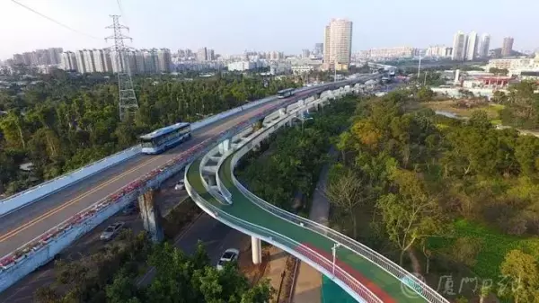 道路间,快速公交BRT粗壮的高架桥墩,有藤蔓缠绕,绿色生机包裹住钢筋水泥的冰冷;