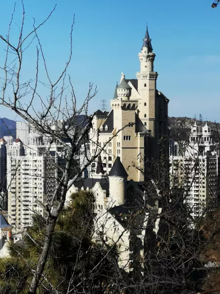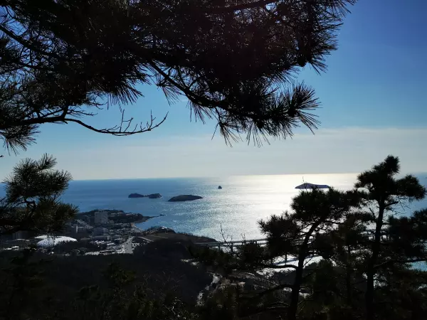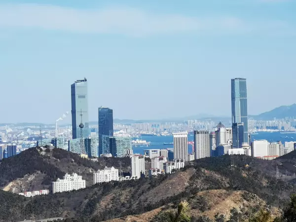山上植被虽然单一还算密集,基本都是松柏之类的。山上路上挂了很多许愿的红色卡片,在海风中沙沙作响。路上可以看到大连的风景,不过到了山顶,才是最佳的观景区域。上面有个专门的观景台是收费的,可以上去喝点东西,慢慢欣赏风景。也可以就在观景台附近看,本身就是一个大平台,视野足够用了,可以看到大连的全景和城市面貌。