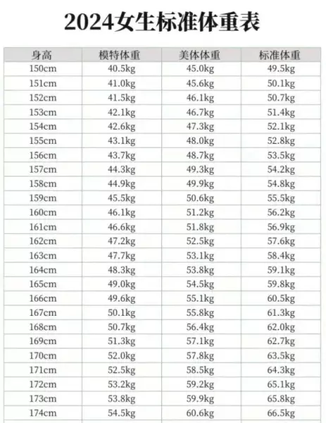根据女生标准身高体重对照表,你会发现女生们盲目地追求两位数的体重是不健康的,南方平均身高160cm的女生们,标准体重是56.2kg(112.4斤)是健康体重,如果盲目地追求两位数的体重,看起来就会显得很干瘪。