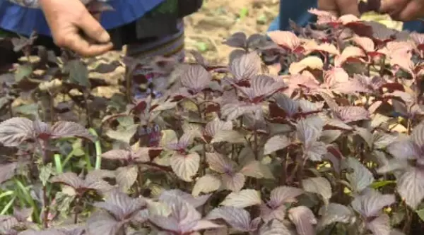 马关县都龙镇坝保村委会后山村 村民 蔡永芬:“我们这个紫苏茶都是清凉解毒的,到夏天我们都喜欢拿紫苏做成茶叶喝。”