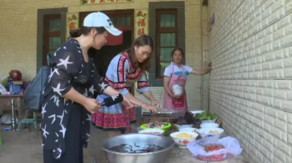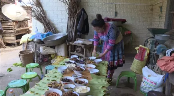 马关县都龙镇坝保村委会后山村 村民 蔡永芬:“苗家紫苏皮干参,是我们苗家传统的一道美食菜,用来招待客人,因为我们加了紫苏,所以就是我们苗家的特色,一般有客人来我们都会用紫苏炒这道菜来招待他们。”