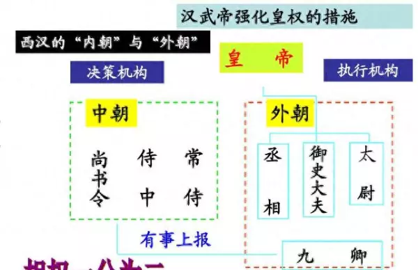 汉武帝将外朝官,也就是丞相府的权利一分为二,将“决策”权利收回,丞相只保留执行权利。